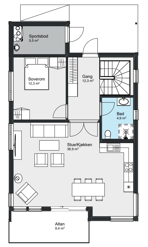 Går du inn hovedinngangen i andre etasje finner du soverom, bad og en åpen stue- og kjøkkenløsning med tilgang til en koselig altan. Går du ned i første etasje finner du resten av fasilitetene du trenger for at Giske skal være en komplett bolig for hele familien.
